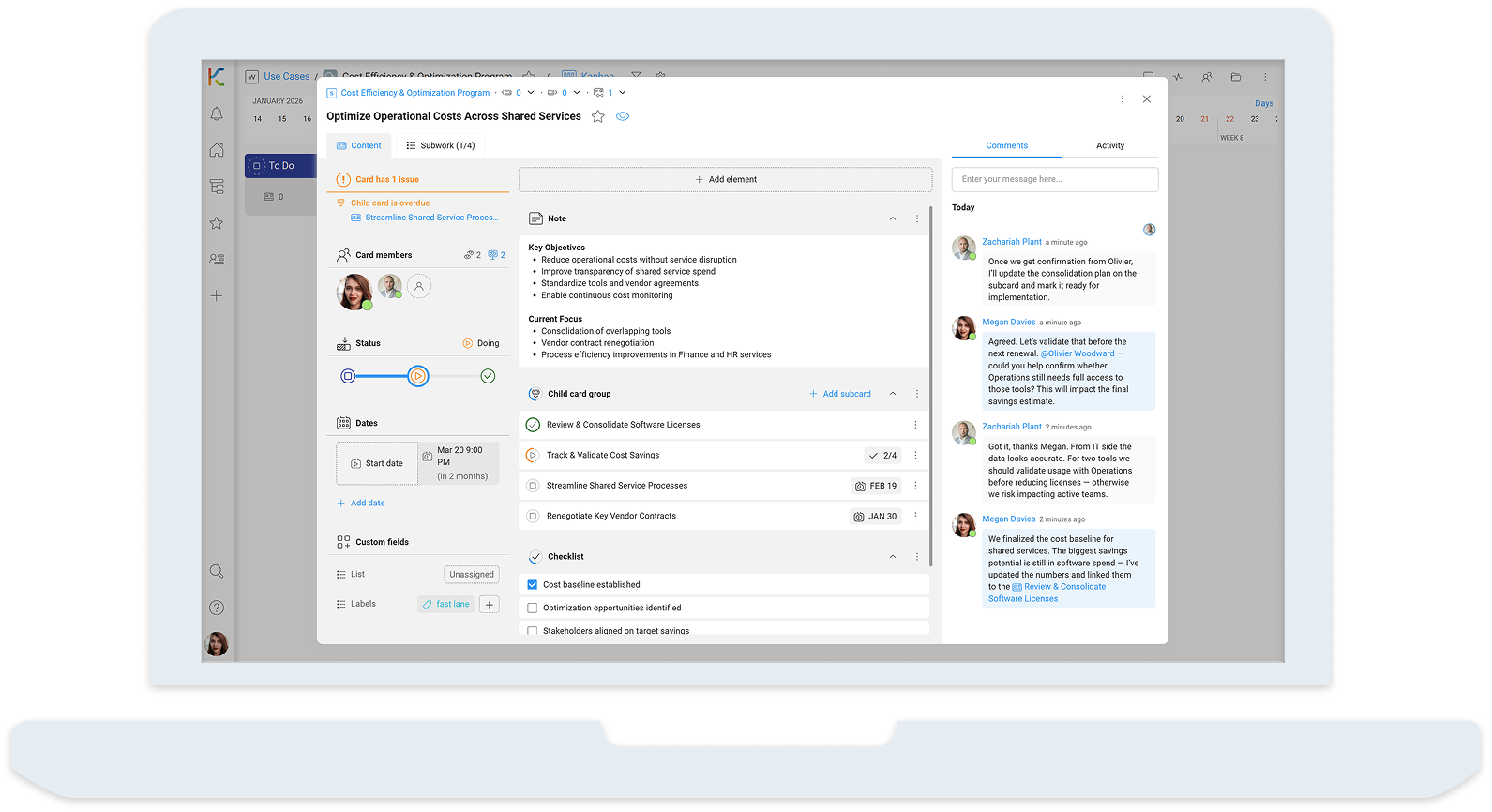 KanBo serves as a centralized cost management platform that helps organizations eliminate waste, track impact, and ensure transparency across departments. Key functional areas include: